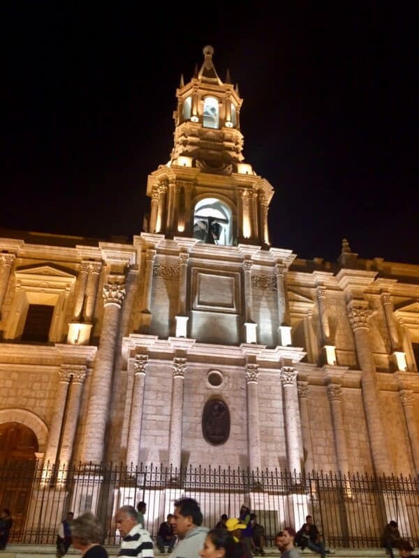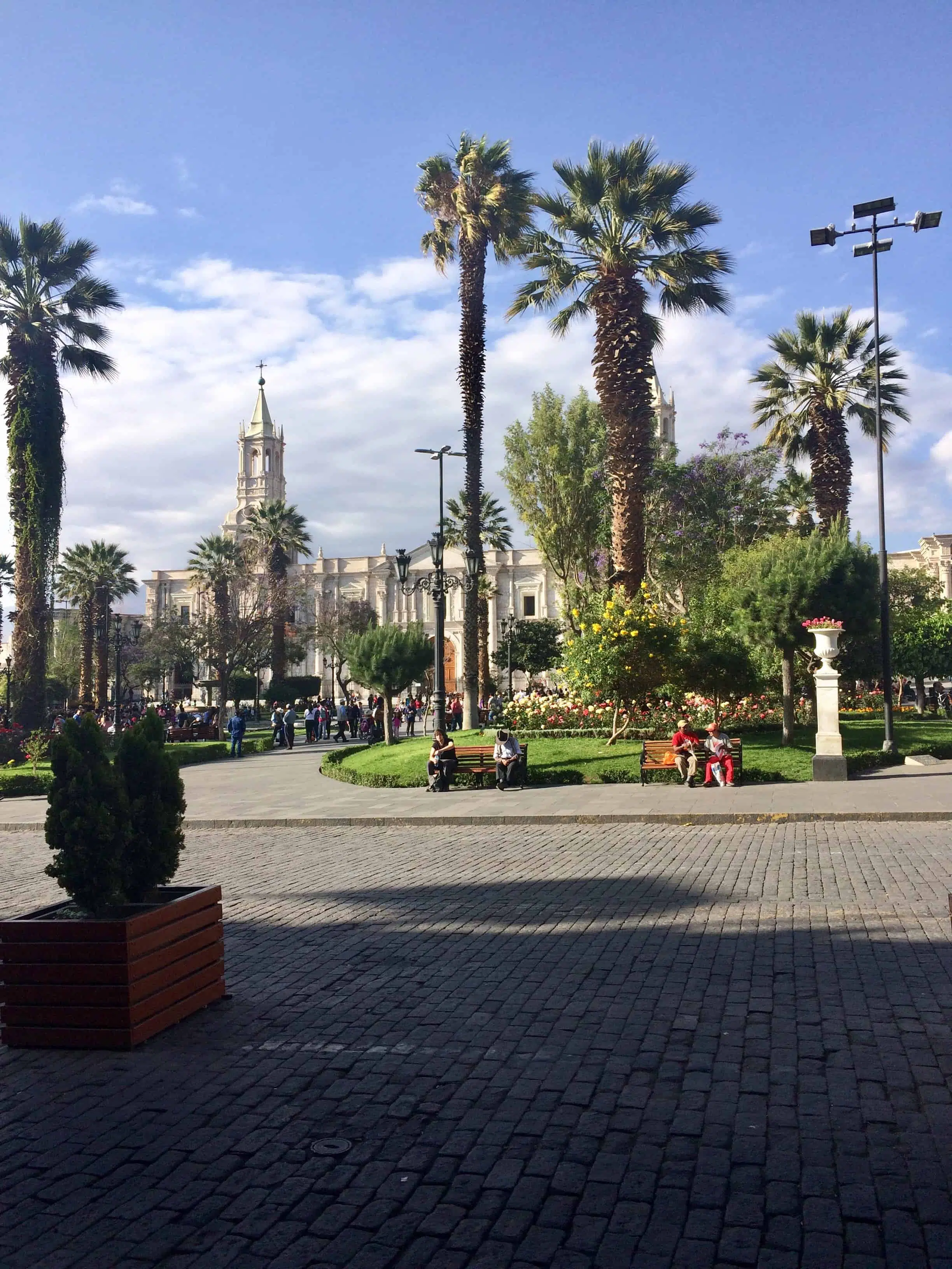 On nous avait tellement complimenté cette ville, qu’on en était presque déçu. Au fur et à mesure que le voyage passe, je pense que l’on devient de plus en plus exigeant. Le centre-ville d’Arequipa est je dois l’admettre, super joli. Surtout la place de la Cathédrale. Il y a des palmiers, des arcades, cette immense cathédrale magnifique. Bref, cette place est superbe. Les rues piétonnes qui entourent la place sont agréables, on peut y faire de belles balades. C’est une fois sortie du centre-ville que le brouhaha péruvien reprend le dessus.