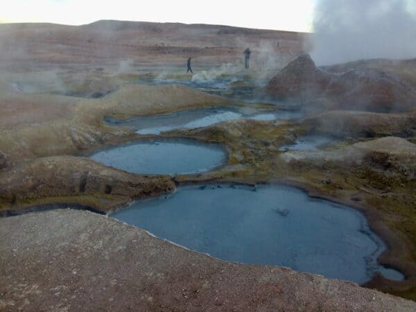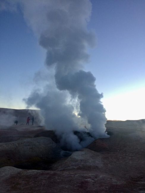 A 4h à 4300 m, il fait -3 degrés. On part découvrir des geysers. Cette fumée sortant du sol est dingue. La chaleur qui en sort l’est tout autant. Le soleil se lève tranquillement. Nous avons maintenant possibilité de nous baigner dans des sources d’eau chaude. Il fait maintenant 0 degré. Je laisse ma place aux autres. On repart ensuite pour la dernière lagune, la lagune verte.