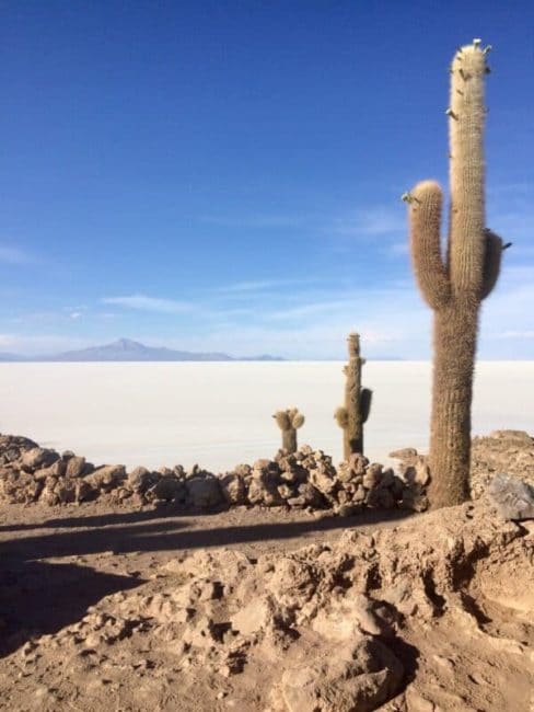 Une fois debout, je me rends compte de la bonne idée que j’avais eu de m’assoir. J’ai le cul amidonné par le sel. Mais tant pis, j’ai un souvenir ! Je prends du sel et on part sur une île. L’île au cactus. Ah bon? Eh bien, j’ai envie d’habiter sur cette île, c’est un gros coup de cœur. Des cactus partout, dans cette île au milieu du désert. On peut y monter. C’est parti pour une balade au milieu des cactus. C’est dingue, je m’arrête toutes les 5 minutes, tellement le paysage est magique.