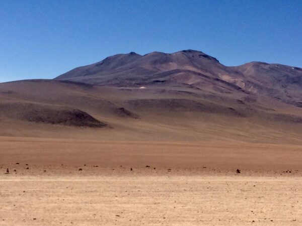 La deuxième journée commence avec la découverte de pierres et volcans qui entourent le désert. Fini le désert de sel, on passe sur un désert plus commun mais tout aussi surprenant. On aperçoit des volcans appartenant au Chili, et un volcan bolivio-chilien, c’est dingue. Et c’est beau.