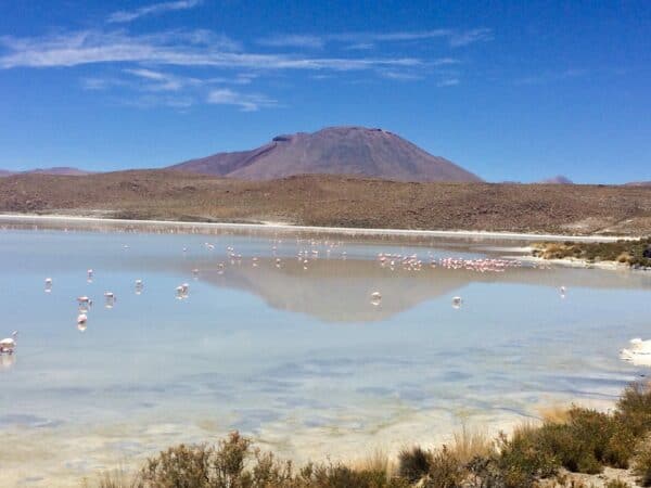 Quelques uns d’entre nous mangent des sandwichs d’alpaga, et nous repartons. Cette fois, on découvre une lagune. Et en Bolivie, qui dit lagune, dit flamant rose. On ne peut pas s’approcher trop près. L’herbe qui se trouve tout autour de la lagune est une protection. On ne marche donc pas dessus. Mais les photos ne donnent rien à ce moment là, c’est tellement beau en vrai.