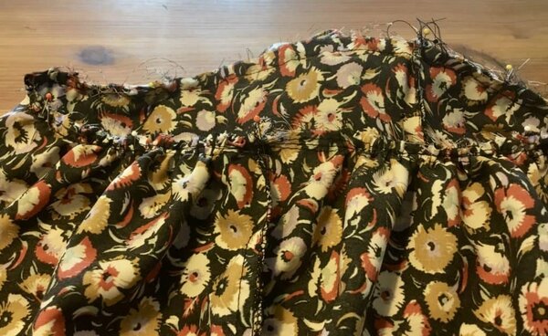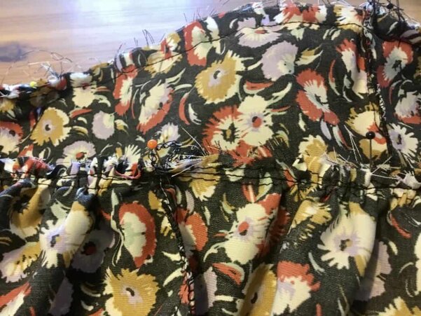 Faisons simples : les fronces sont positionnées endroit contre endroit avec notre haut. Positionnez les coutures côtés de la jupe sur les coutures côtés du haut pour avoir un bon repère.
