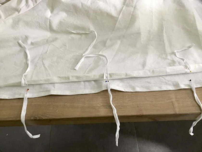 Épinglez les rubans sur l’envers de l’ourlet milieu dos. Ils sont espacés de 20 cm chacun.