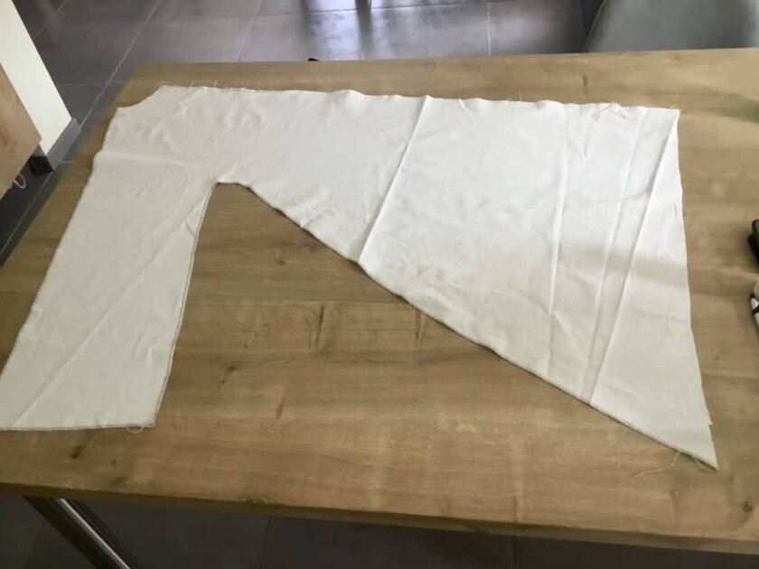 Vous allez découper, Deux demis dos et un devant (pour découper qu’un devant, placer le milieu sur la pliure du tissu). Le patron est le même pour le dos et pour le devant.