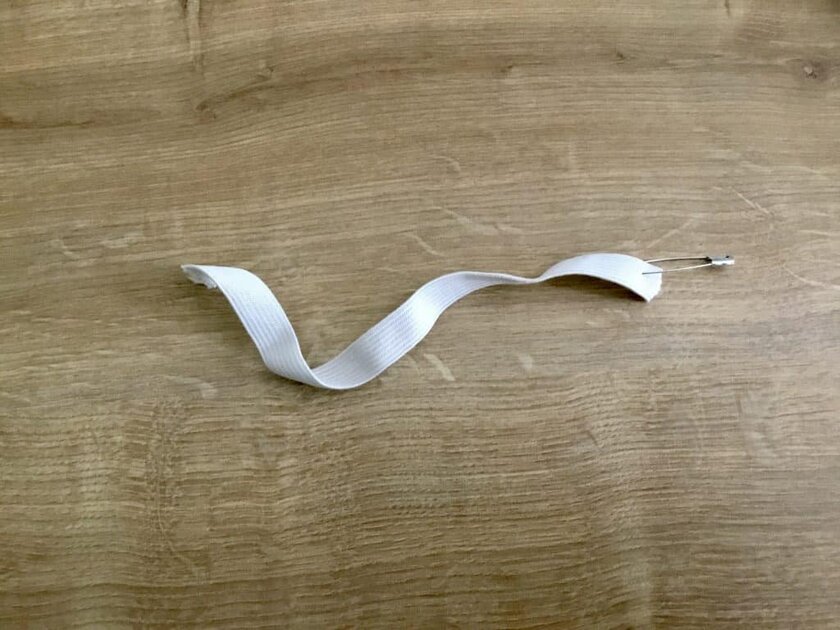 Mettez une épingle à nourrice d’un côté de l’élastique pour l’insérer, et épinglez l’autre côté de l’élastique sur le tissu pour ne pas le perdre.