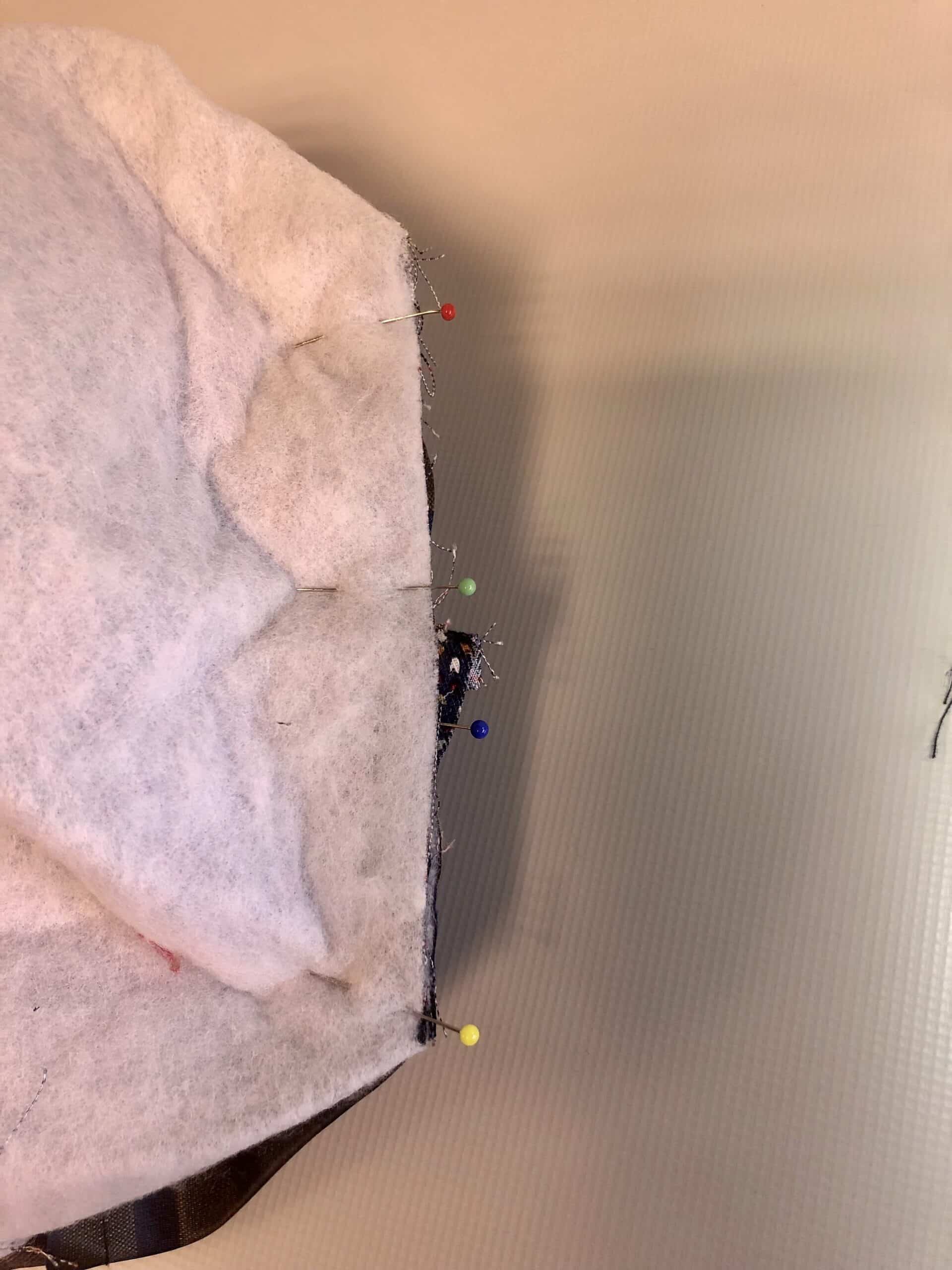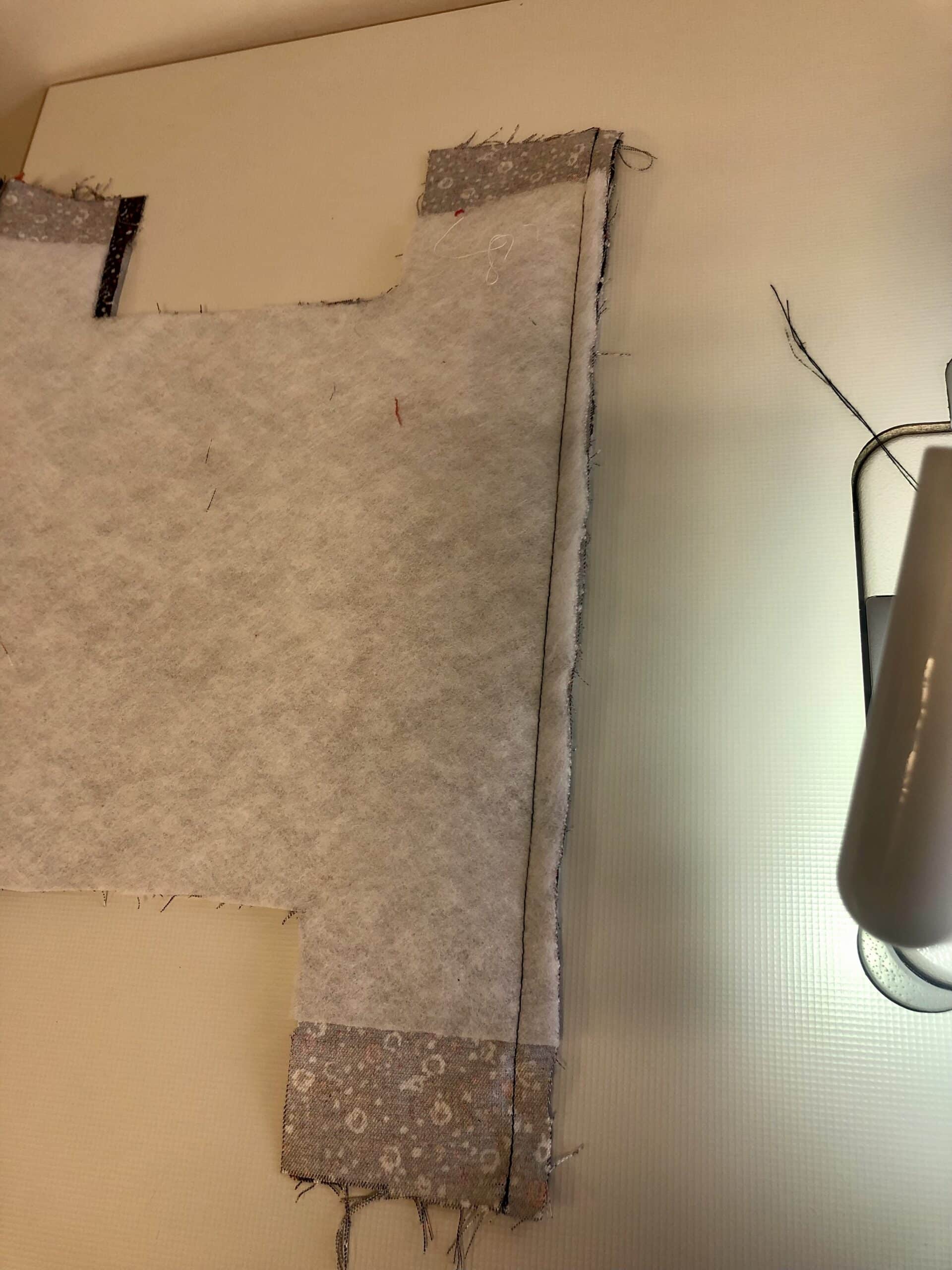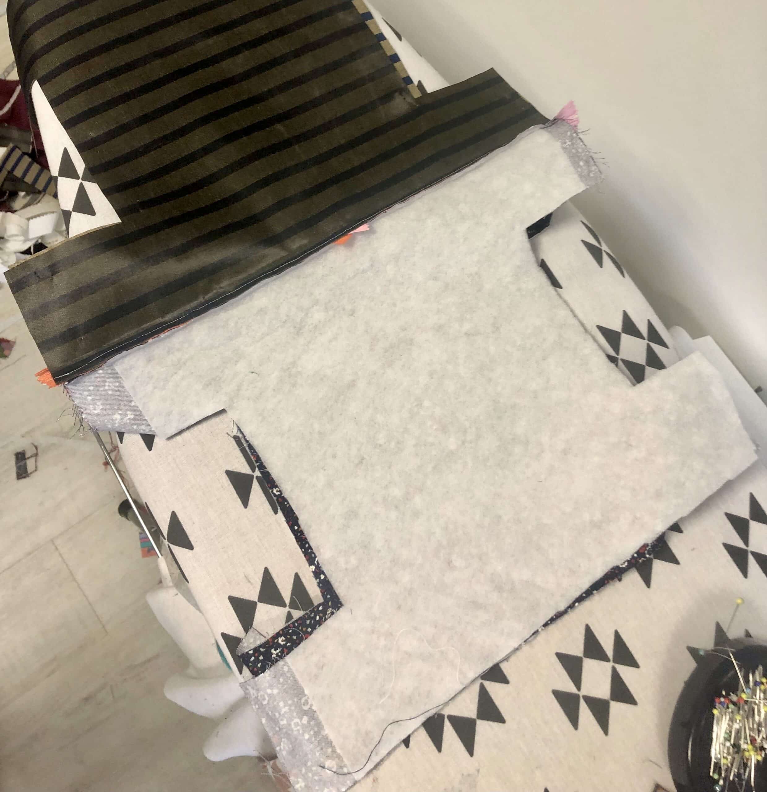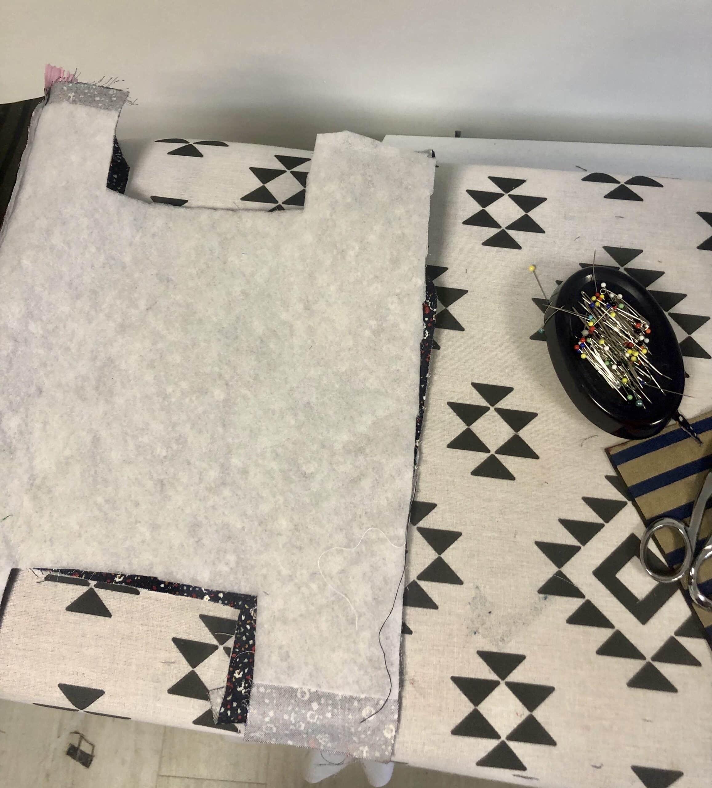 Prendre du molleton non thermocollant : dans ce cas, couper le molleton plus large de 1 cm tout autour, repasser le tissu sur le thermocollant, épingler les deux épaisseurs ensemble, et coudre le à 0,5 mm du bord, tout autour des 2 devants.