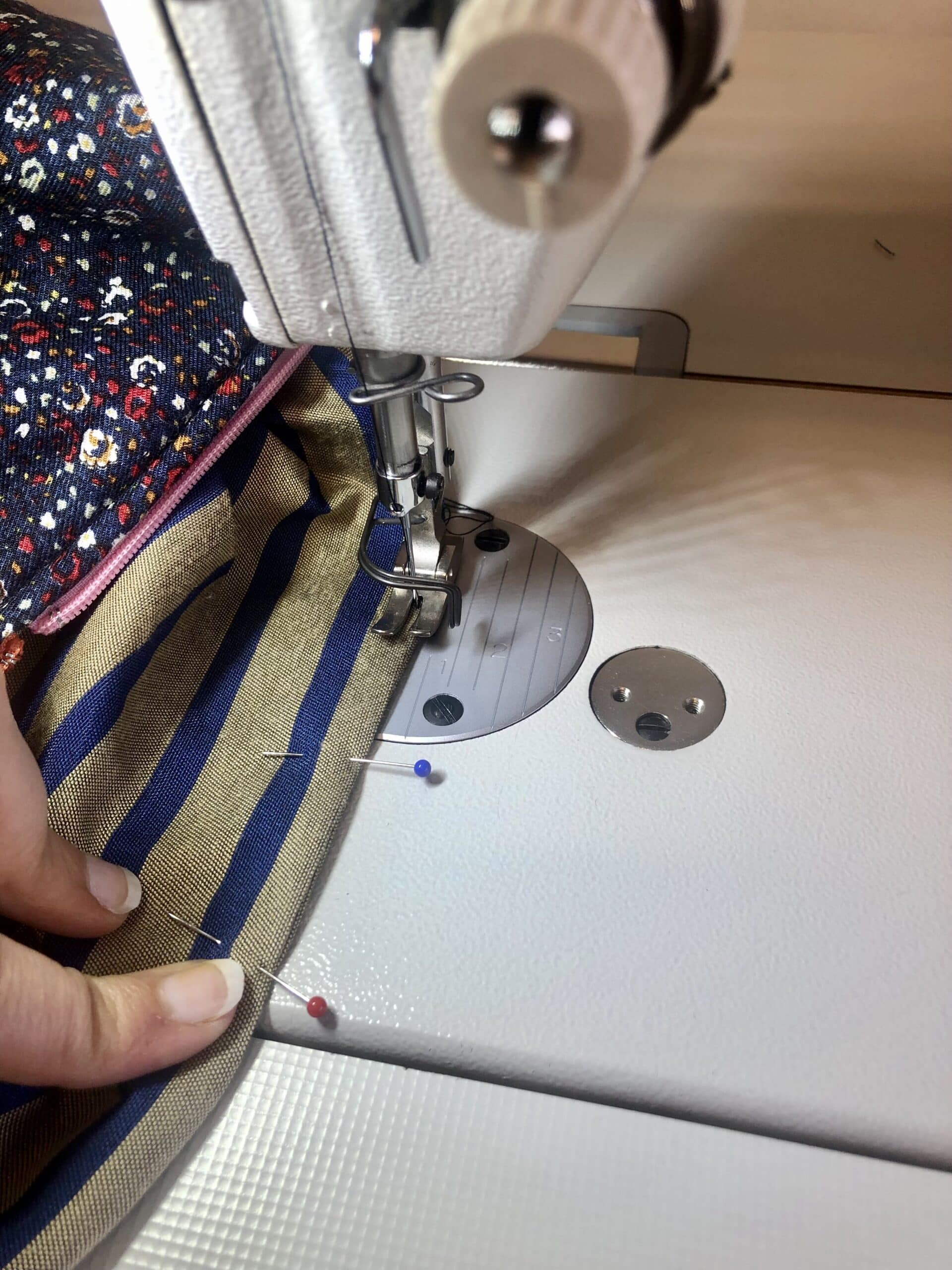 Je m’explique, on va venir coudre le bord de la trousse, on a la doublure plier en deux contre le dos de la fermeture, et le corps plié en deux contre l’endroit de la fermeture : nous avons donc 4 épaisseurs (on peut même en avoir beaucoup si jamais on a fait les tirettes). Allez c’est parti, on se laisse pas impressionner, on rassure notre machine en lui disant que c’est rien pour elle et on fait cette couture au deux extrémités de la fermeture à glissière.