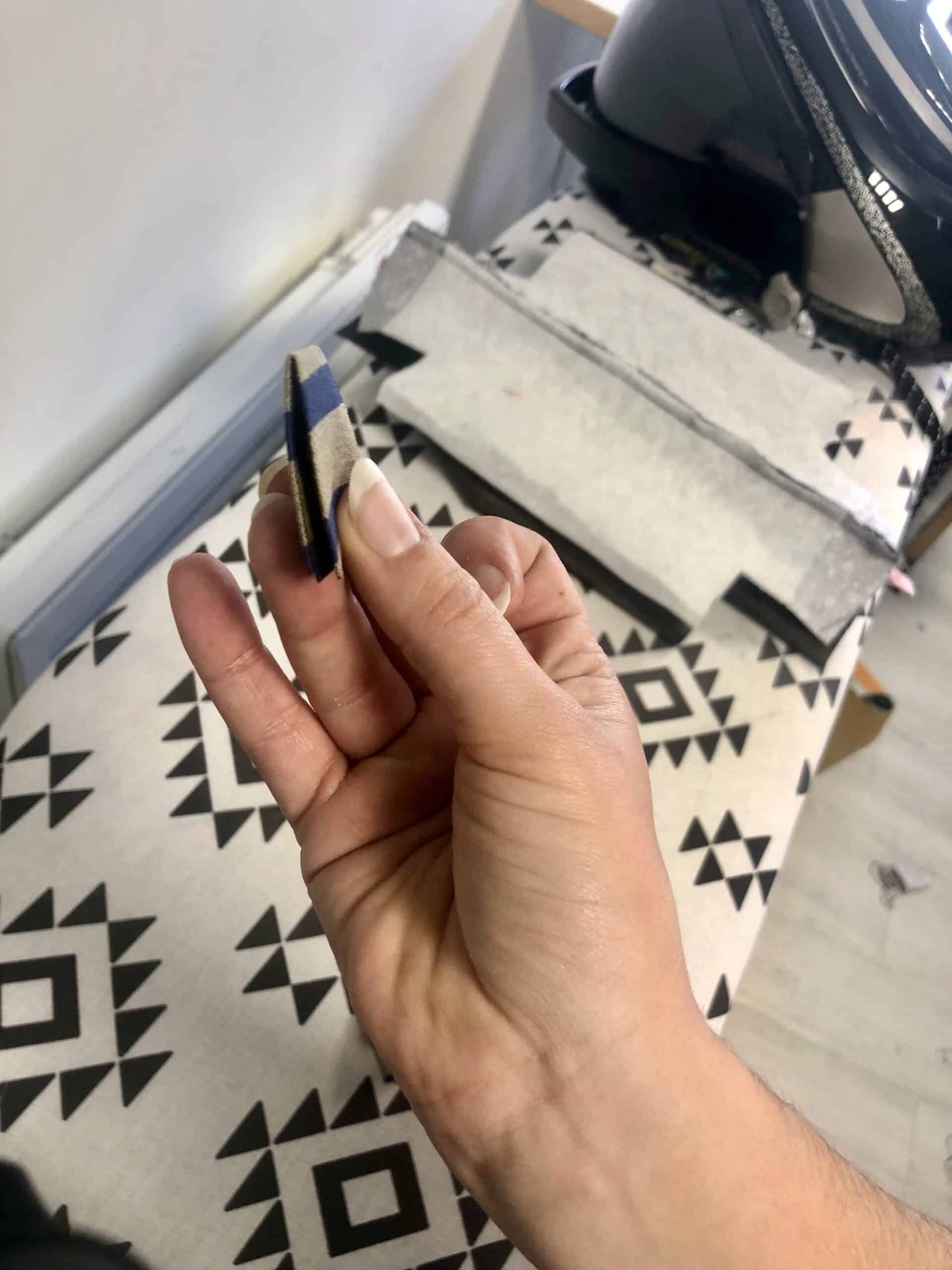 Si jamais tu as envie de les faire, il suffit de prendre le petit bout de tissu que tu as coupé tout à l’heure, de le plier à 3 sur la longueur et de le replier en deux ensuite.