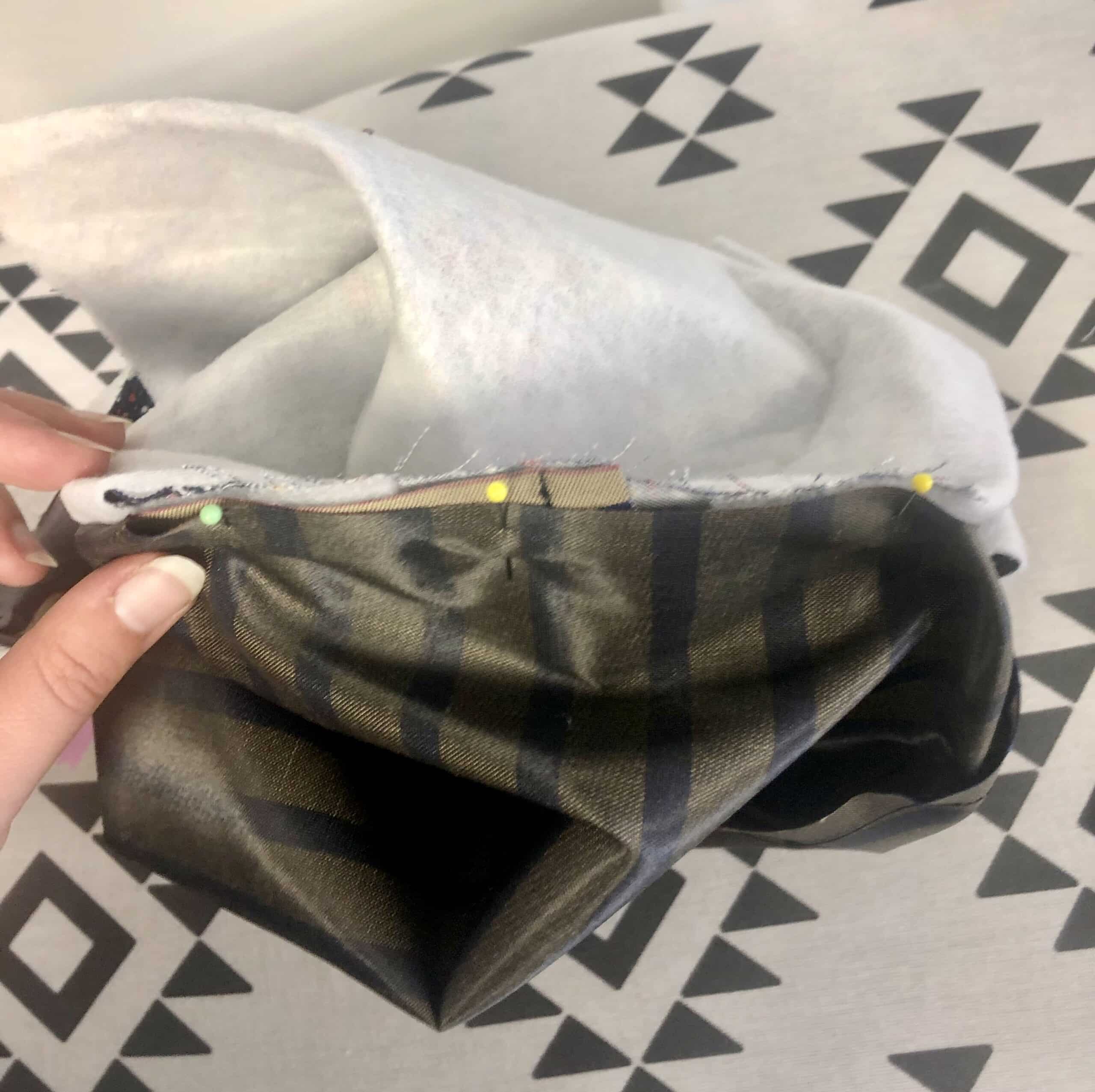 On met toujours son tissu endroit contre endroit et on assemble les coins doublure et corps ensemble. Donc nous allons avoir 4 coutures à 4 épaisseurs (c’est mon chiffre préféré, c’est un signe ?).