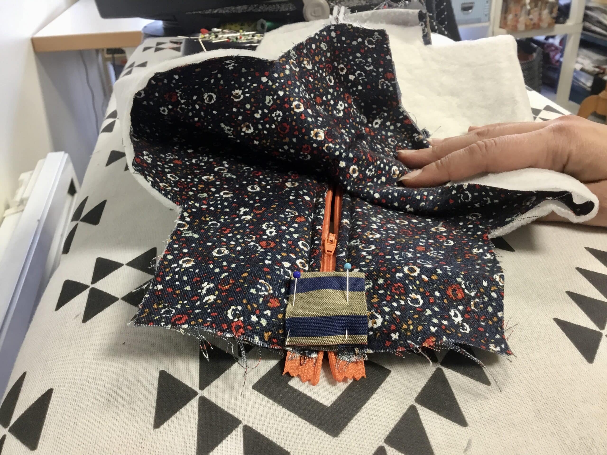 Pour faire simple (c’est qui n’est pas facile quand on doit expliquer en toute lettre, une chose qui se montre beaucoup plus facilement !), on prend la doublure et le tissu, on le positionne endroit contre endroit sauf qu’on insère la fermeture à glissière. On l’a pris, comme on dit chez moi « en sandwich ».