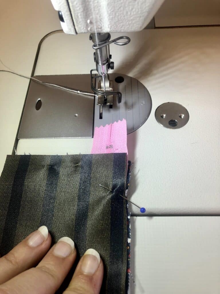 Donc, concentration s’il vous plaît, nous allons mettre l’endroit de la doublure face à nous, puis, positionner l’envers de la fermeture à glissière contre le bord de la doublure. Nous ajoutons ensuite l’endroit de la pochette contre l’endroit de la fermeture.